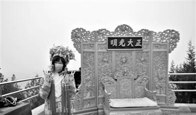 昨日,一名游客在北京景山公园内戴口罩着古装拍照。京城重污染5天无缓解。新华社发