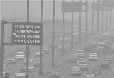 昨日,在天津市快速路上,电子显示牌显示出近日的机动车限行尾号。昨起天津启动重污染天气尾号限行措施。新华社发