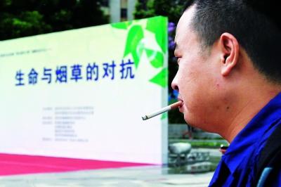在一个禁烟宣传活动现场,有人旁若无人地吸烟。