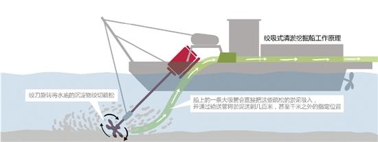 今年拱墅区在余杭塘河首次尝试了一种新方法,采用绞吸式清淤挖掘船担当清淤主角。这种清淤挖掘船的船体前端有绞刀。作业时,绞刀会将水底的沉淀物绞切疏松。然后,船上的一条大吸管会直接把这些疏松的淤泥吸入,并通过输送管将淤泥送到几百米甚至千米之外的指定位置,挖掘和运送一次性完成,具有效率高成本低的特点。
