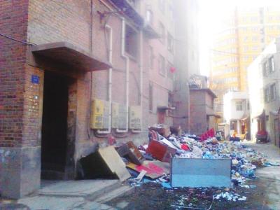 3月10日,家住东岗东路拱星墩的刘先生拨打本报热线反映,东岗东路1498-1500号居民楼下,堆满了垃圾,而且时间很长了,一直不见有人清理。
