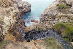 在海蚀洞景区,碧蓝色的海浪冲击礁石化作朵朵晶莹浪花,而从海岸悬崖间飞泻而下的却是臭气扑鼻、泛起油渍泡沫的污水——一条自山庄客房方向流出、在灌木草丛中隐蔽穿行的排水渠,将带有异味的污水直接引入碧海,污水流经之处的灌木大都发黄枯萎。“如此壮美的海岸地貌算得上是深圳的旅游名片了,但景区里出现污水渠真是大煞风景,污水不但染黑大海,也给深圳的城市形象抹黑。”一位来大鹏观光的外地游客如此感慨,一旁作陪的叶先生本想尽地主之谊,听到这样的话深感脸上无光。