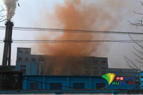 从海威钢铁总部厂房内冒出大量红色烟尘。王风华 摄