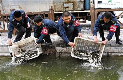 昨日,奥林匹克森林公园,工作人员将鱼苗放流,用来生态净水。 新京报记者 尹亚飞 摄