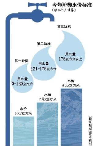 新京报讯 北京市发改委昨日发布消息,5月1日起,北京居民水价、非居民水价和特殊行业水价将同时进行调整。居民阶梯水价按照提交听证会的方案二执行,即第一阶梯户年用水量不超过180立方米,每立方米水价为5元;第二阶梯户年用水量在181-260立方米之间,每立方米水价为7元;第三阶梯户年用水量为260立方米以上,每立方米水价为9元。