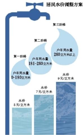 北京市发改委昨日发布,综合考虑听证会参加人及社会各方面意见,北京市居民水价调整政策按照提交听证会的方案二执行。即:第一阶梯户年用水量不超过180立方米,水价为每立方米5元。同时,按照“多用水多负担”的原则,第二阶梯户年用水量在181-260立方米之间,水价为每立方米7元;第三阶梯户年用水量为260立方米以上,水价为每立方米9元。新调整的居民水价将从今年5月1日起实施。