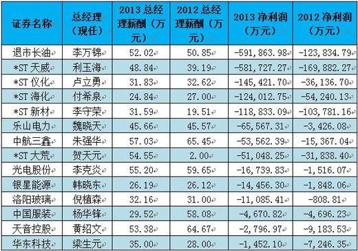 除了薪酬数目,年薪波幅也值得关注。数据显示,较去年涨幅在100%以上的有12家企业,其中*ST大荒总经理薪酬涨幅竟高达2627.50%,但公司净利润则从2012年亏损31,838.40万元,上升到2013年亏损51,048.25万元。业绩持续下滑,但总经理薪水不降反升。据悉,*ST大荒控股的黑龙江省北大荒米业集团有限公司已连续多年巨额亏损,上市公司因此负累甚重。今年一季度,*ST大荒已转让米业公司的全部股权,甩掉包袱后,能否“摘星脱帽”有待关注。
