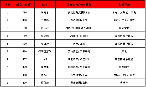 《新财富》2014“新财富500富人榜”前十名榜单
