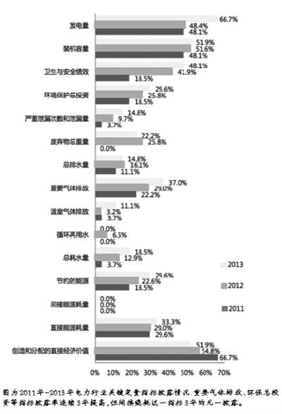 数据显示,2013年,在电力行业所有指标中,企业对“装机容量”、“发电量”、“创造和分配的直接经济价值”的披露率均超过50%,对二氧化硫、氮氧化物以及烟尘等“重要气体排放”指标的披露水平保持逐年提高,2013年有近4成企业对其进行披露。企业对直接能耗量、节约能源量、环境保护总投资、总耗水量、卫生与安全绩效等指标的披露水平在近3年有不同程度提高。
