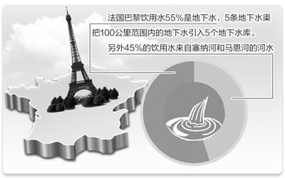独特的供水系统也是法国水质保证的特色之处。比如,巴黎市区有两套供水系统:一是提供饮用水;二是提供清洗街道和调控湿度用的非饮用水。巴黎饮用水55%是地下水,5条地下水渠把100公里范围内的地下水引入5个地下水库。地下水库的储水量为120万立方米,相当于巴黎一天半的用水量。另外45%的饮用水来自塞纳河和马恩河的河水。法国自来水多采用新式臭氧处理,其灭杀细菌、病毒的能力优于传统的臭氧处理,而且没有异味。法国饮用水号称是“控制最严格的食品”,自来水的质量要符合62条严格的测试标准,不仅要干净,还讲究口感、气味和透明度,可以直接喂养婴儿。所以,法国不仅有品香水和品酒廊,也有品水这个特殊行业,仅巴黎就有近20个品水点。