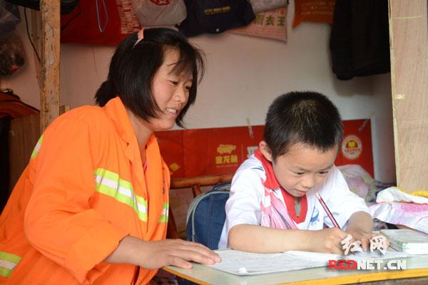 每天打扫了一天得卫生之后,80后环卫工人刘敏顾不上劳累,坚持为孩子辅导家庭作业。