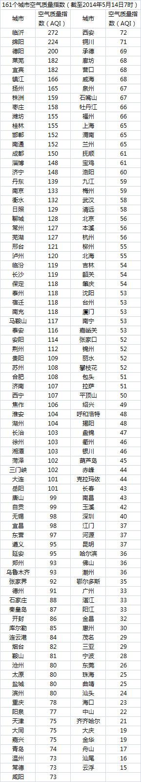 说明:自2014年1月1日起,环保部发布空气质量实时信息、空气质量月报及参与空气质量排名的地级城市已由74个增加到161个,包含了直辖市、省会城市、计划单列市、“三区”所有地级城市、环保重点城市和环保模范城市。人民网环保频道将采用环保部的官方数据,对161个城市每日空气质量进行排行。