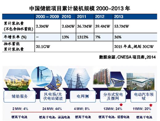 据中关村储能产业技术联盟(CNESA)项目库不完全统计,从2000-2013年底,中国共有76个规划、在建和已投运的储能项目(不含抽蓄、储热及压缩空气)。其中,已投运的项目在电力系统的累计装机量为53.7MW,占全球装机规模的7%。2011年,由于国家风光储输示范项目的开展,装机规模增速大幅提升,同比2010年增长了百倍。