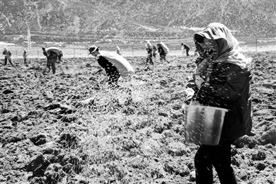近年来,四川省甘孜州稻城县实施国家天然草原退牧还草工程,草原退化现象得到有效遏制和扭转。时下,正值川西高原春季,稻城县农牧科技人员纷纷下乡植绿护草。图为稻城县农牧和科技局技术人员正播撒草种。