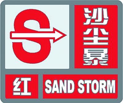 沙尘暴红色预警信号:预计未来6小时内可能出现特强沙尘暴天气(能见度小于50米)。