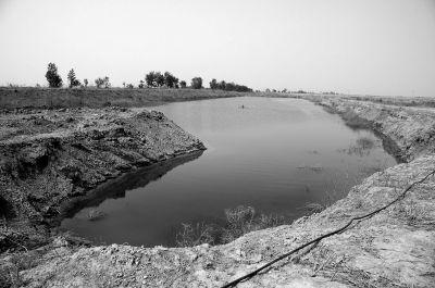 一处深坑里已积满水,一个增氧机漂浮其上。