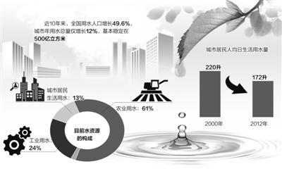 不过,水资源短缺的“阴云”中也显现出一些积极的信号。住建部数据显示,近10年来,全国城镇化率提高了10个百分点,用水人口增长了49.6%,但城市年用水总量仅增长12%,2000年至2012年,城市居民人均日生活用水量从220升降低到172升。