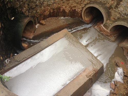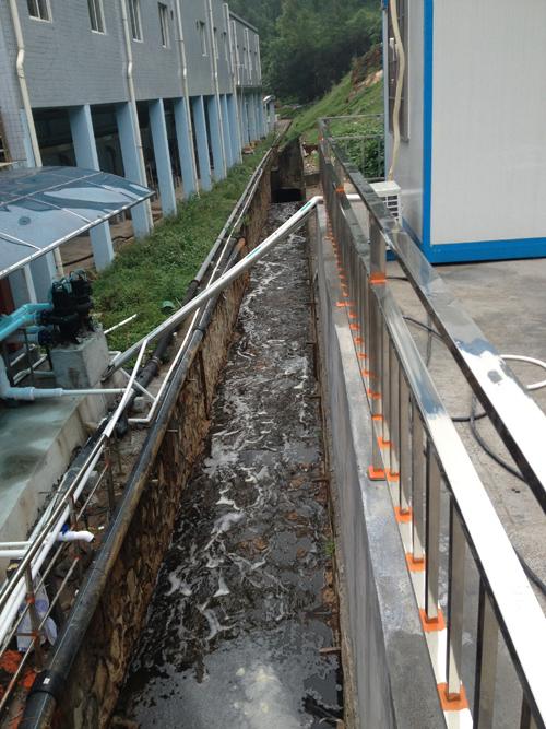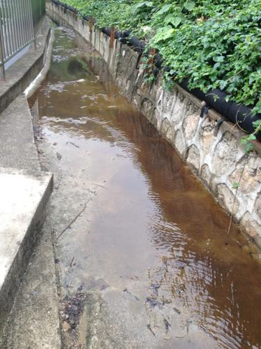 ③下坪填埋场渗滤液处理设施后面的排水沟,红褐色的污水直接进入地下排水管道。