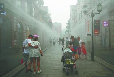 昨天下午,雾霾天气下的汉街,喷雾水管开启,降霾降温。记者胡伟鸣 摄