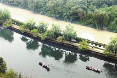 该图片说明称:“从高处往下眺望,一堤之隔的浙东古运河,由于被上游洪水污染而呈黄色,但是墙内的东湖水却是黛青色,水质清澈,鱼翔浅底。两者形成明显反差。”