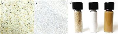 图② 从左至右分别是未经提纯加工的沙子(b),提纯加工过的沙子(c)以及前两种沙子与纯纳米硅的对比(d)。
