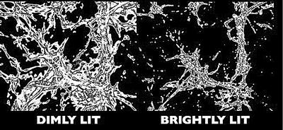 计算机模拟的星系间氢气,显示“昏暗宇宙”(左)和“明亮宇宙”(右)两种情况:明亮宇宙所需的高能光子(用于分解中性氢原子)是昏暗宇宙的5倍。哈勃太空望远镜观察到的氢原子吸收情况与右图吻合;但用已知的紫外光源,产生了左图昏暗得多的结构,与观察有巨大偏差。