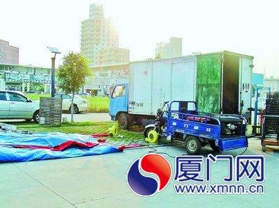 昨日下午5点多,记者来到同安文体中心。在文体中心后面的空地上,记者看到摊贩摆着娱乐设施招揽客人。其中,一辆三轮摩托车的后斗上放着两台发电机,伸出的黑色管接到了吹气机,进而连接到一张蹦蹦床。
