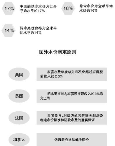 根据2008年国际水务情报机构(Global Water Intelligence)和经济合作与发展组织(OECD)进行的全球水价调查结果来看:与全球平均水平相比中国的供水水价为世界平均的17%;污水处理价格为平均水平的14%;综合水价为平均水价的16%。因此,我国的水价在全球范围内处于较低水平。