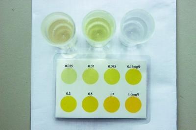 做实验的是环保组的王喆老师,她先倒取20毫升自来水,使用余氯检测试剂,将其缓缓滴入自来水中,然后进行摇匀处理。在静置了三分钟后,原本透明的水开始发生变化,变成了淡淡的黄绿色,经过和色卡的比色,记者发现,自来水中余氯的含量介于每升0.025毫克和0.05毫克之间。