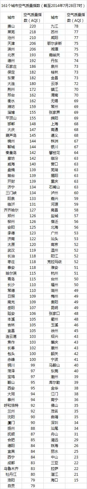 说明:自2014年1月1日起,环保部发布空气质量实时信息、空气质量月报及参与空气质量排名的地级城市已由74个增加到161个,包含了直辖市、省会城市、计划单列市、“三区”所有地级城市、环保重点城市和环保模范城市。人民网环保频道将采用环保部的官方数据,对161个城市每日空气质量进行排行。 (杨翼)