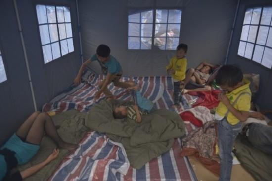 8月4日,云南鲁甸,孩子们在救灾帐篷中玩耍。赵永峰 摄