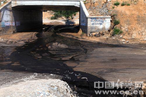 陕西省府谷县郭家湾工业区内,一道黑色的污水从府谷县漠源镁业煤化有限责任公司(以下简称漠源镁业煤化)厂区内流出,黝黑的污水堂而皇之的在公路上流淌并流入悖牛川。