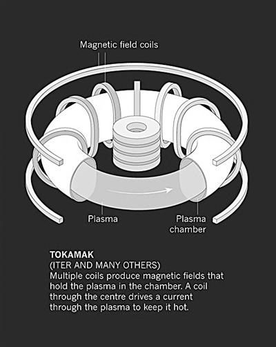 从理论上说,建造一个聚变反应堆就是要仿造一个太阳。用合适的氢同位素或其他轻元素,加热把电子从原子核附近剥离,成为一种等离子体,然后挤压这些等离子体,让它们的原子核融合在一起,使一部分质量变成能量。但在实践中,试图模仿一颗恒星会导致可怕的工程问题:困在磁场中的极热等离子常常会扭曲,就像一条被激怒的蛇,不顾一切地要逃出来。