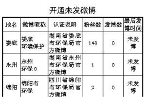 他看来,广大群众是环境污染的受害者和第一目击者,群众期待通过微博反映环境问题和诉求,而不活跃、不回复的政务微博,伤了老百姓的心。“衙门未开、击鼓又有何用”?于是,他开始统计各地环保部门的政务微博,寻找未及时更新的政务微博,目的是督促开通,与民互动。