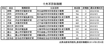 事实真的如此吗?记者日前对部分统计结果进行了核实。记者发现,河北省11个地级市中,石家庄、廊坊和衡水等地环保部门尚未设立政务微博,其他地级市设立了政务微博但绝大部分都是不活跃、不回复的僵尸微博。其中,@唐山市环保局自2013年9月12日实名认证后,发布的微博数量仅为两条;@邯郸环保发布数量仅为1条,粉丝有965人。