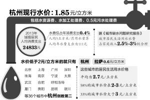 目前,杭州居民用水消费在生活成本的占比极低。2013年,全市城镇居民家庭人均可支配收入39310元,增长10.1%,人均消费支出为24833元,比上年增长10.3%。