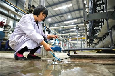 4月17日,北控曹妃甸海水淡化公司车间内,一名检验员正对生产出来的脱盐纯净水进行检测。新京报记者 尹亚飞 摄