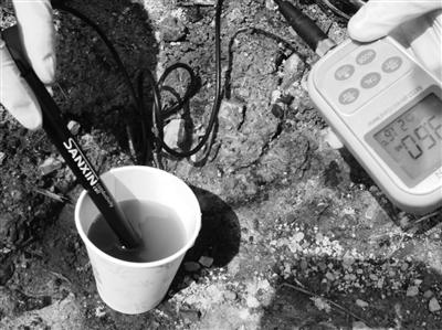 检测人员在“小南化”土壤及地下水中检测到58种挥发性有机物、89种半挥发性有机物以及13种重金属。图为检测人员在对地下水进行检测 。 胡韬摄
