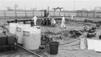 南京化工厂占地700亩,为了解清楚土壤污染情况,土壤修复人员在这里进行了为期两年的环境风险评估。图为修复人员在进行土壤修复。 胡韬摄
