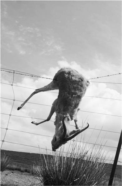 除了寄生虫侵扰、饮水困难、野狼捕杀等生存危机外,草场上的网围栏已经对普氏原羚的生存构成了严重威胁。图为一只被挂在网围栏上已经死亡的普氏原羚。 邵文杰供图