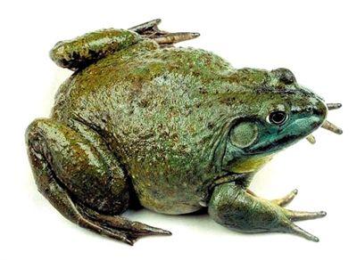 牛蛙 是蛙类中较大的一种,头部宽扁。雌蛙背面褐色,雄蛙背面深绿色。雄蛙鸣声洪亮,远闻似牛叫,故名牛蛙。吃昆虫、小鱼等。肉可食,是著名食用蛙种。原产北美。