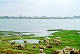 羊群在查干诺尔湖畔吃草。