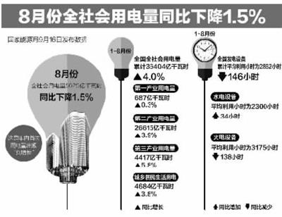 8月份,全社会用电量同比下降1.5%,是年内首次用电量出现“负增长”。这一方面与8月份全国气温偏低有关,另一方面与经济结构持续调整导致经济增速放缓有关。专家表示,从中长期来看,经济结构调整成效初显,短期数据波动无碍中国经济平稳运行