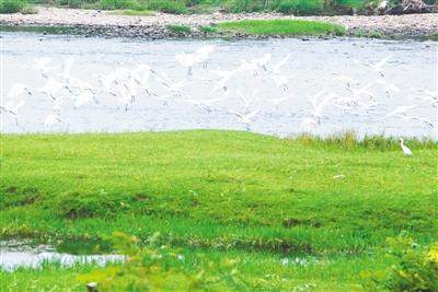 浙江省建德市航头镇溪边村寿昌江附近的大片湿地里,成群白鹭在觅食翱翔。 在“五水共治”中,航头镇不但加强沿江村庄的环境卫生整治,而且为候鸟、鱼类和两栖类、爬行类动物提供了良好的栖息繁殖条件,有效保护了生态环境。