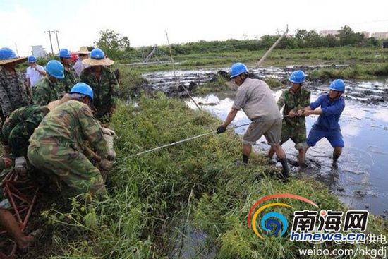 主城区基本恢复供电后,海口电力抢修工作已转向乡镇。记者在35千伏桂演线抢修现场看到,该线路因1基电杆倒塌,数基倾斜,造成35千伏演丰变电站失压,致使演丰镇及北港岛近万名客户停电。100多名抢修人员正在现场进行抢修,因工作环境恶劣,导致两台挖掘机深陷泥潭,抢修工作难度较大。由于野外施工条件复杂,海口电力抢修工作还将持续1至2天。