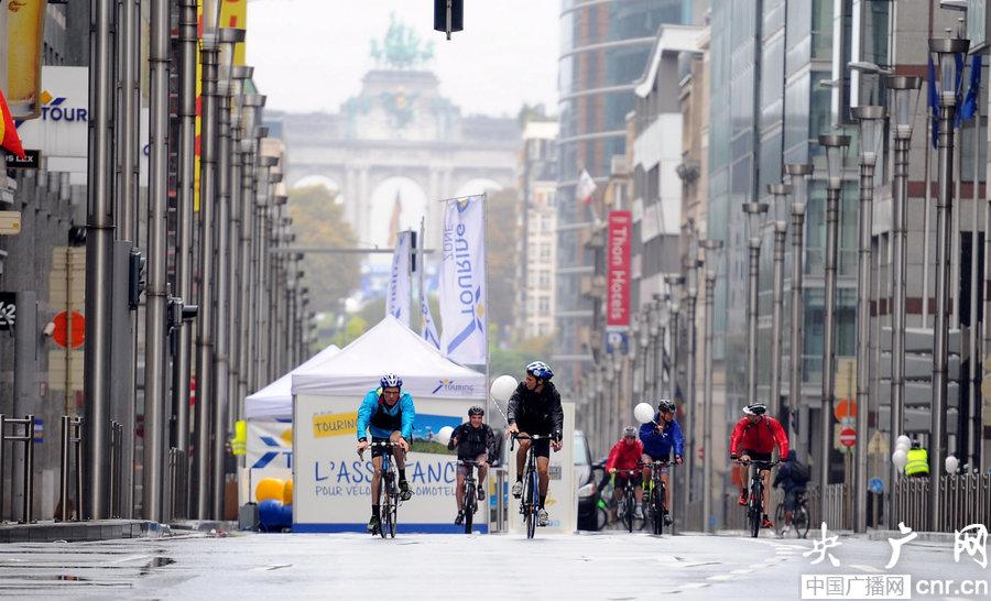 当地时间2014年9月21日,比利时布鲁塞尔,比利时迎接世界“无车日”,布鲁塞尔划出19个无车区,居民骑自行车或马出行。