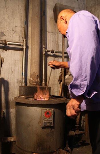 神木兰炭通过添加一定比例的助燃剂、黏结剂压制成型后,制成民用洁净型煤,送往居民家中。图为北京一居民正在试烧神木兰炭型煤。 彭雪摄
