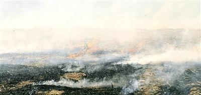 向北行驶10来分钟后,高速路西边依然有人在焚烧秸秆,而东边则有不少刚刚燃烧过的灰烬,剩下少许明火。