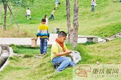 南华宫小学生到公园捡垃圾。(记者 张梁 摄)
