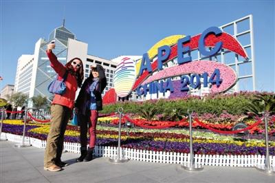 昨日,西单,市民在APEC主题花坛前拍照。新京报记者 薛珺 摄